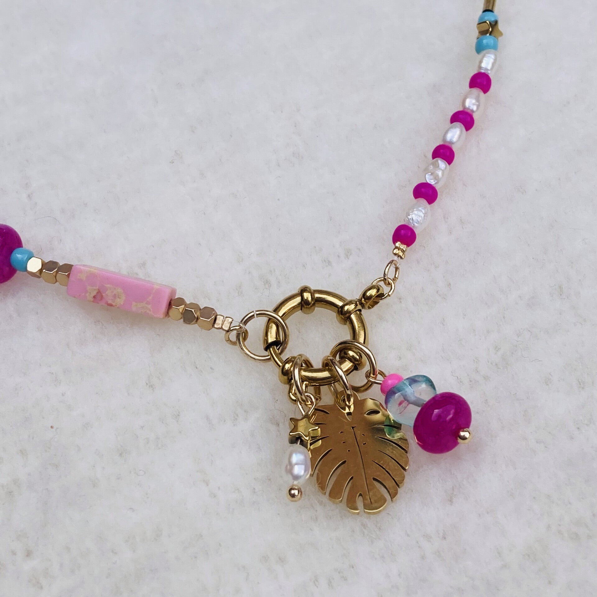 Materialen: glasparels, schelpkralen, rocailles, zoetwaterparels, RVS ketting