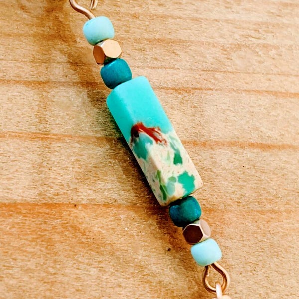 Materiaal: oorringen en staafje van RVS, parels van halfedelsteen, rocailles pareltjes