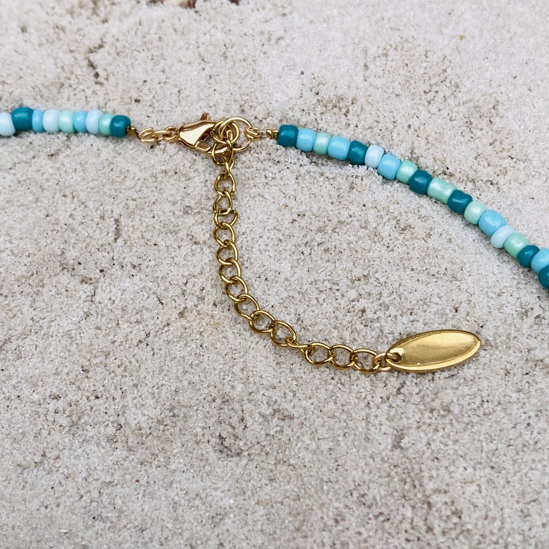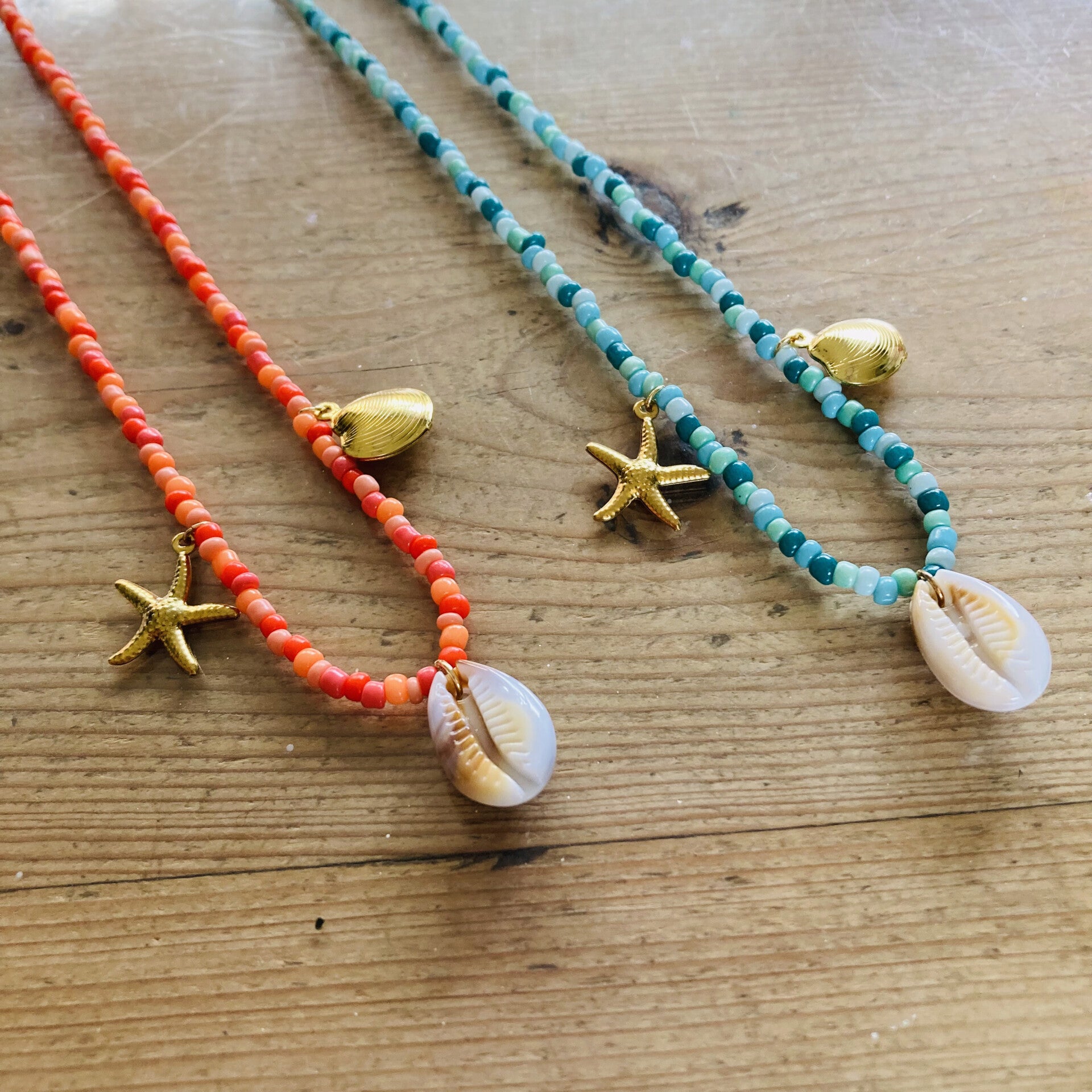 Materialen: rocailles, RVS bedels, acryl kaurischelp, RVS sluiting + verlengketting