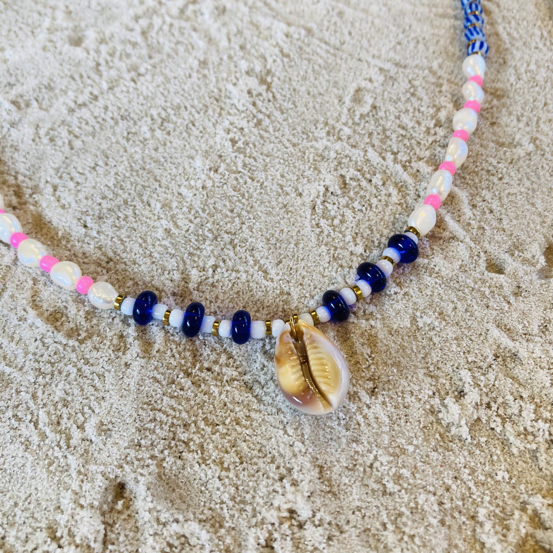 Materialen: glaskralen, schelpkralen, zoetwaterparels, rocailles, RVS bedels, acryl kaurischelp, RVS sluiting + verlengketting